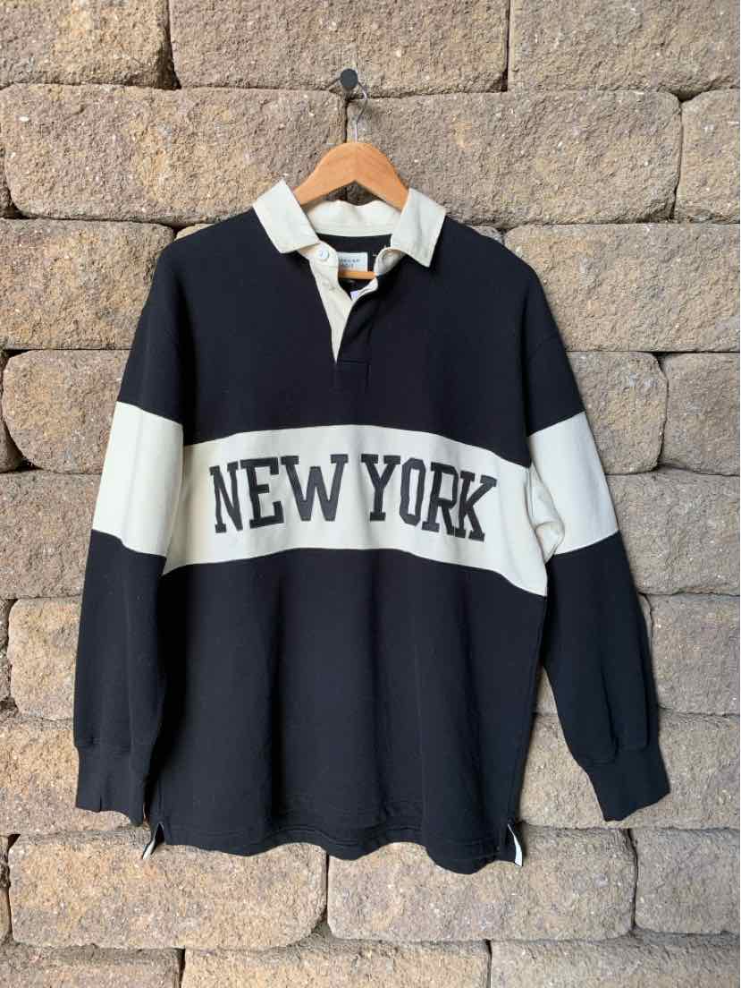 BK/CR VARSITY STYLE POLO LONG SL SHIRT, NEW YORK ON FRONT