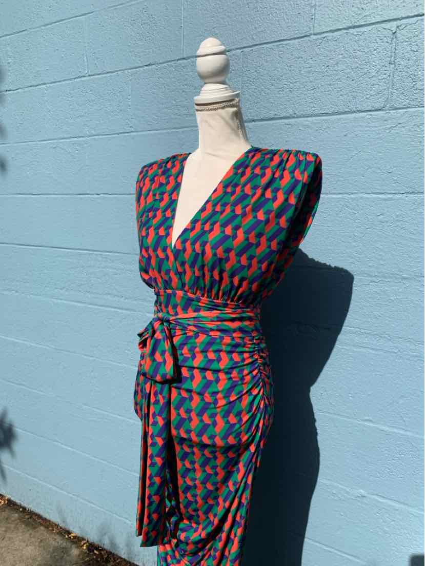 GR/PL/RD PATTERN SLVLESS RUCHED MIDI, W/ BELT TIE