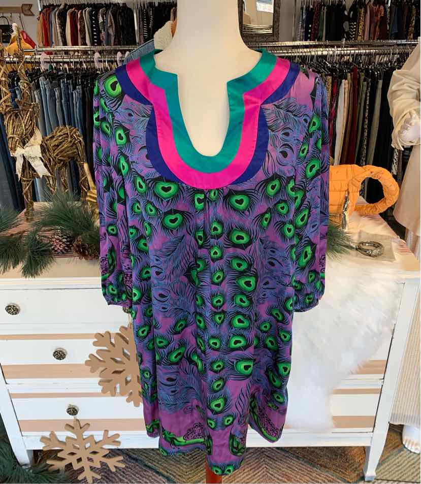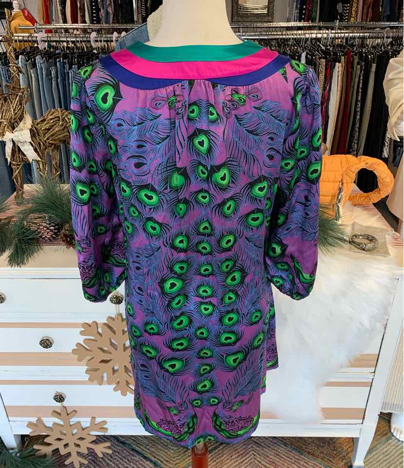 PL/PK/GR PEACOCK FEATHER PRINT SILK DRESS