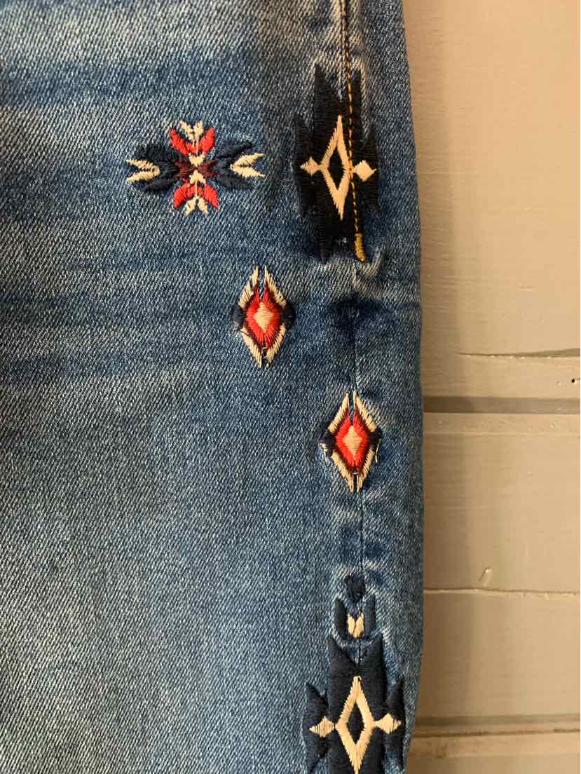 MED BL STRAIGHT LEG JEAN W/ MULTI COLOR EMBROD DETAIL