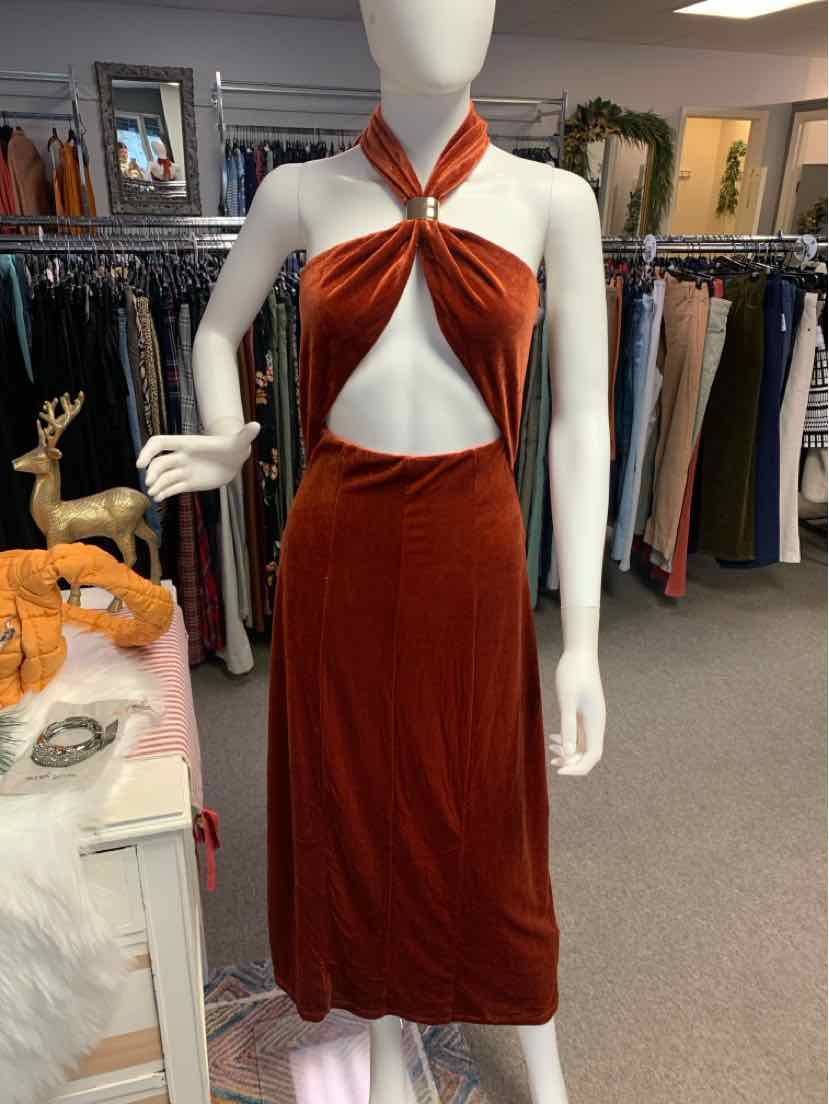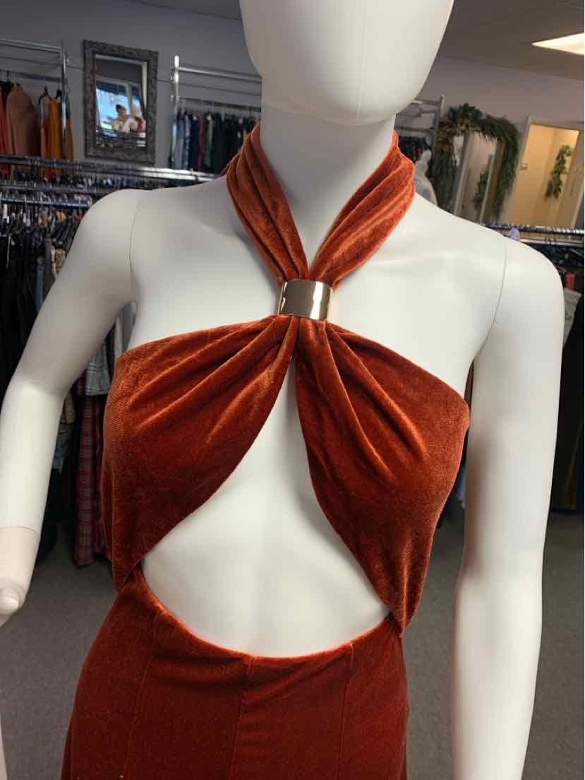 RUST VELVET HALTER DRESS, OPEN FRONT CUTOUT GD CLASP, BACK ZIPPER, NWT