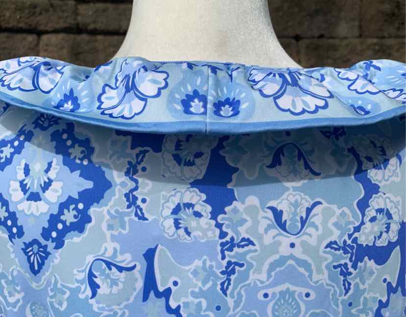BL/NY/WH 3/4 SLEEVE MULTI PRINT, RUFFLE COLLAR, NO SIZE TAG - LARGE BASED ON WEBSITE MEASUREMENTS