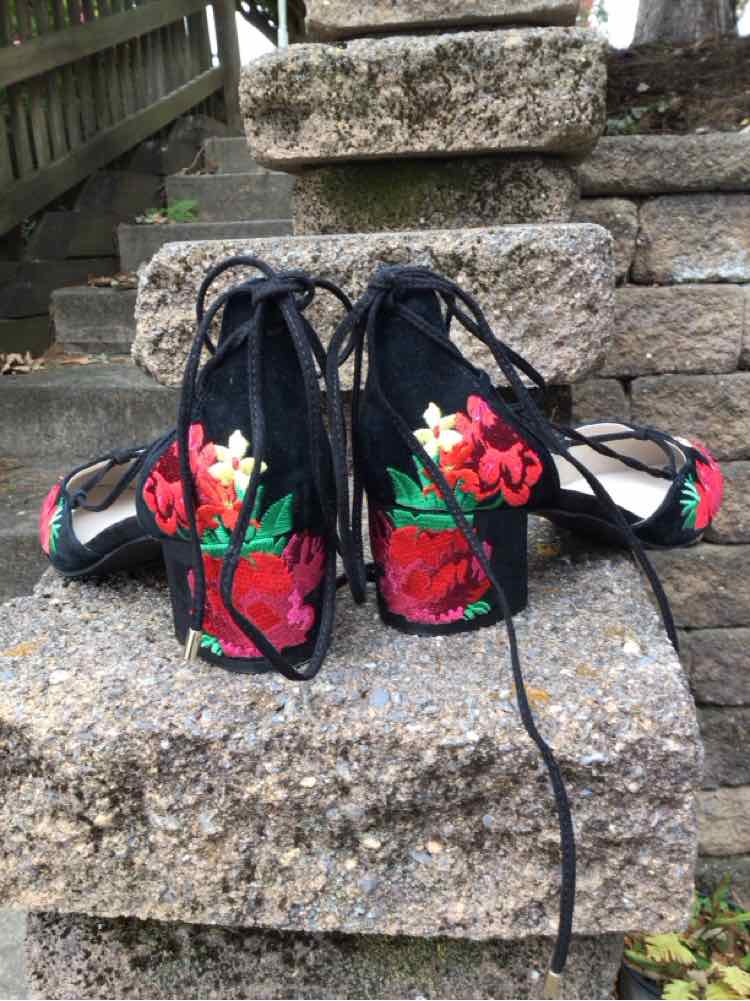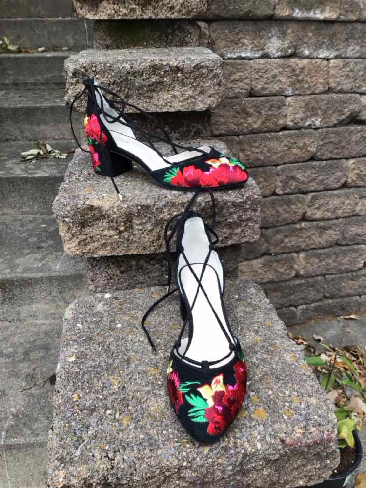 BK/FLORAL BLOCK HEEL, EMBROIDERED STYLE