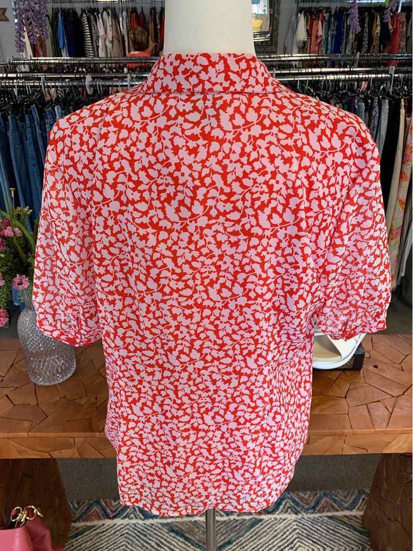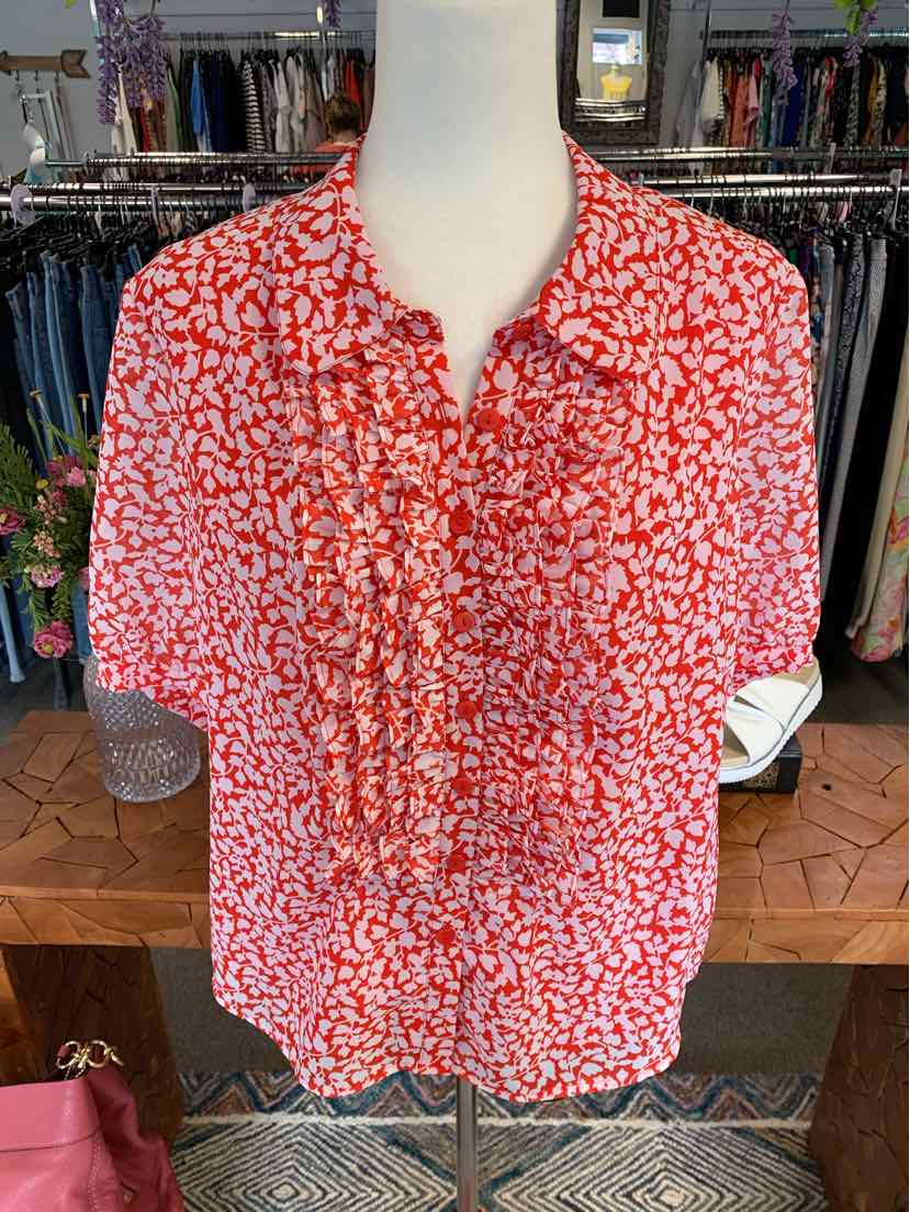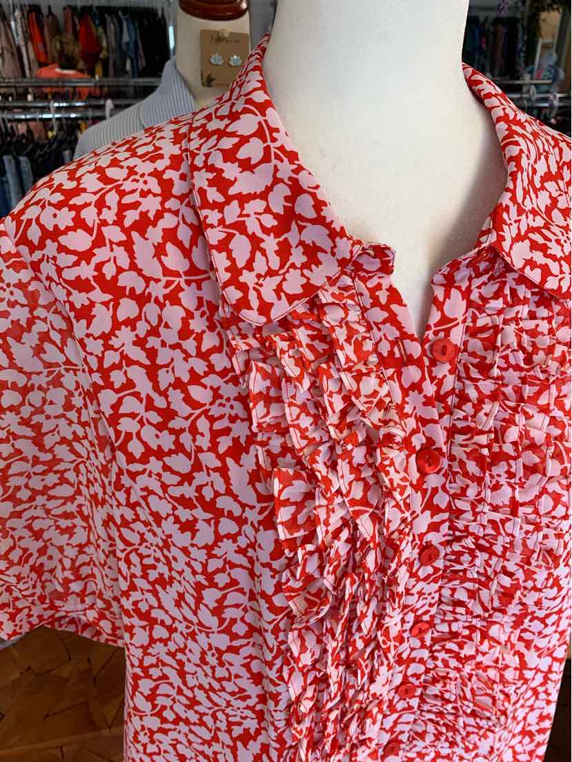RD/WH S/S BUTTON UP BLOUSE WITH RUFFLE DETAIL ON THE FRONT