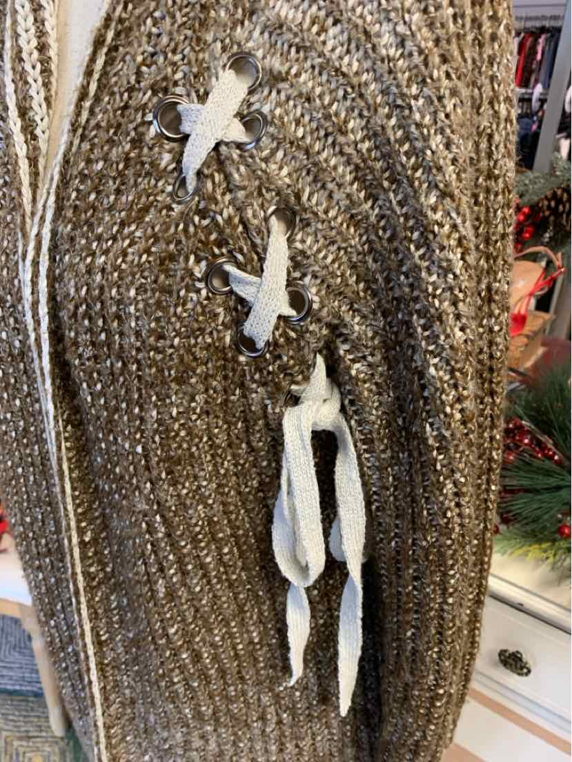 DARK GR/WH HOODED KNIT BRAIDED CARDIGAN SWEATER W/ SIDE LACE DETAIL
